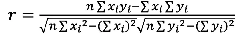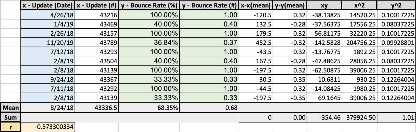 This is the formula I followed to solve for r, the Pearson Correlation, that measures a linear dependence between x and y. In this case, date and bounce rate.