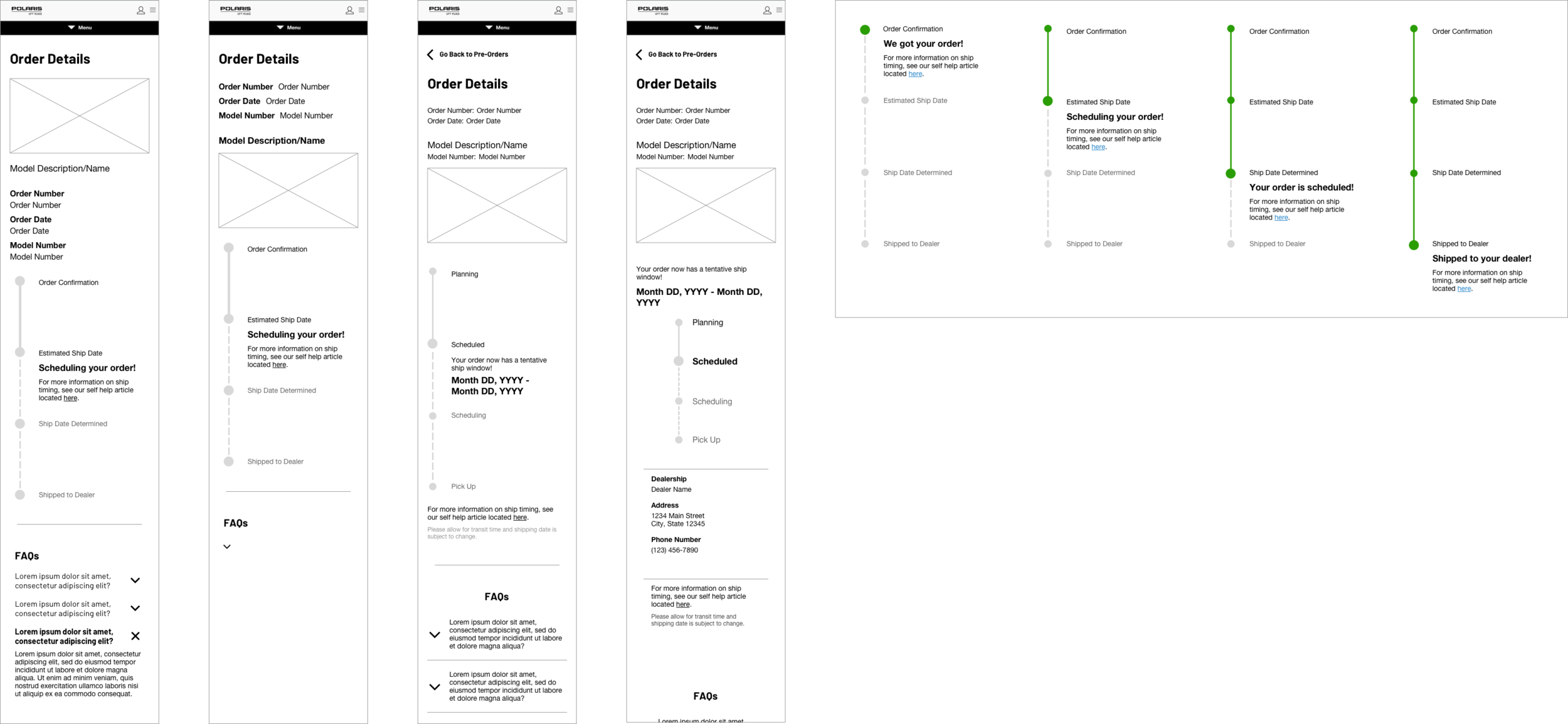 The layout for the detailed information with the pre-order. Users have informed access to their dealership, FAQs, and understandable status on their order.